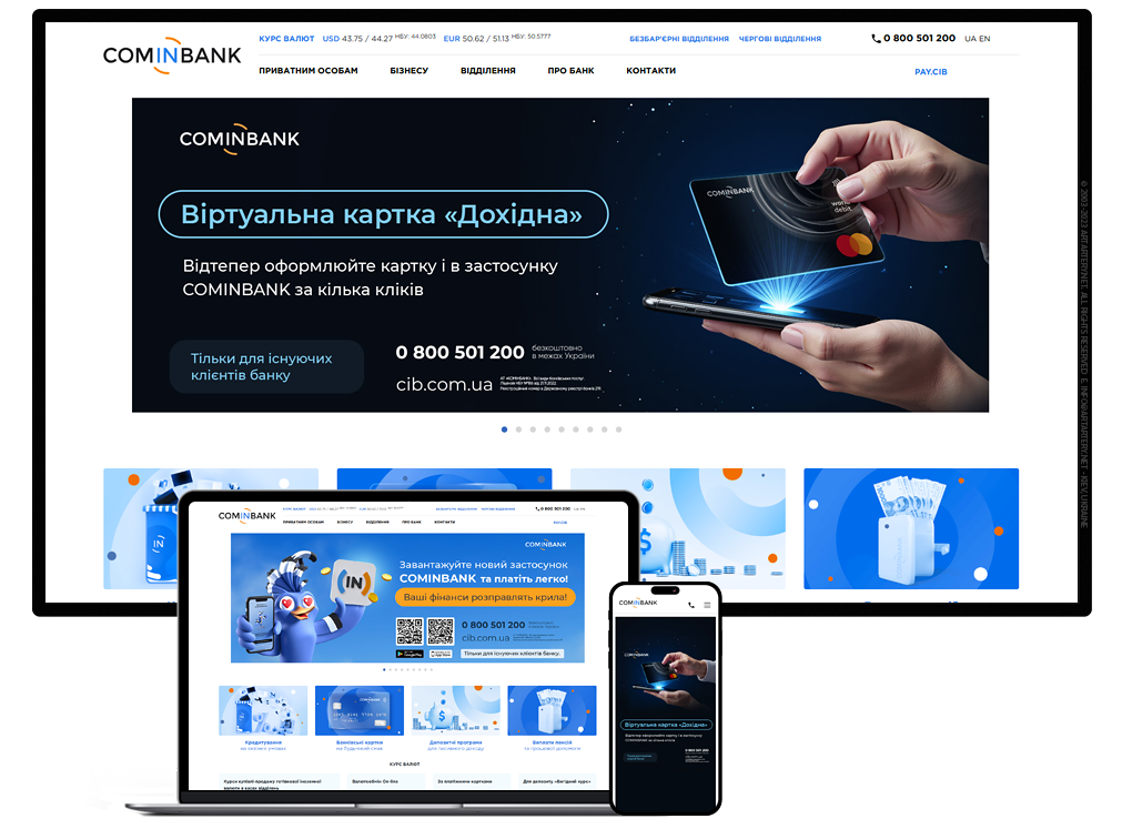 Digital-агентство artARTERY виконує розробку, технічну підтримку, доопрацювання та розвиток сайту банку для АТ «КОМІНБАНК» (COMINBANK) як критично важливої digital-платформи банківських сервісів. Команда artARTERY працює як технологічний підрядник, забезпечуючи комплексний супровід корпоративного сайту банку, модернізацію функціоналу, підвищення продуктивності та стабільну роботу online-сервісів банку.